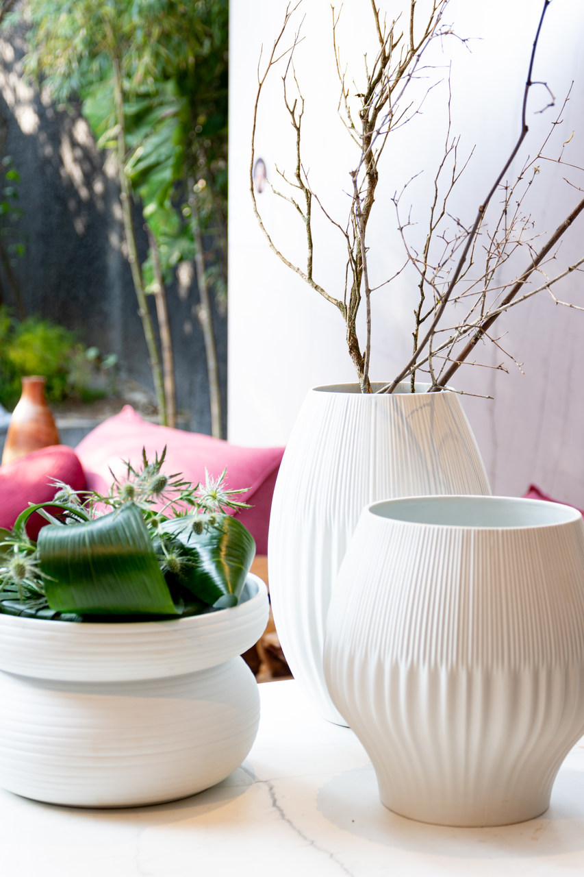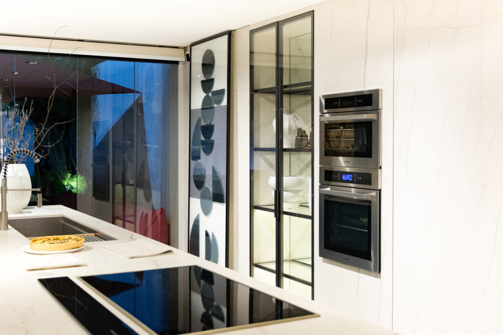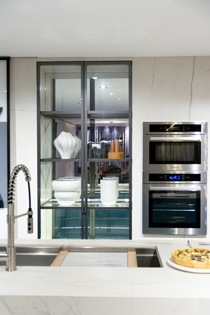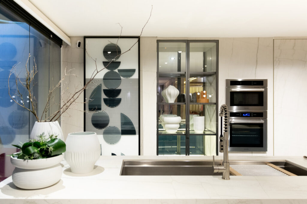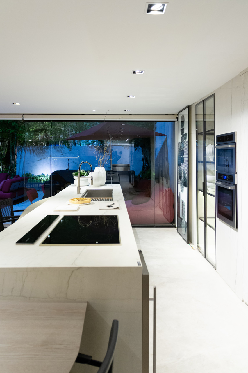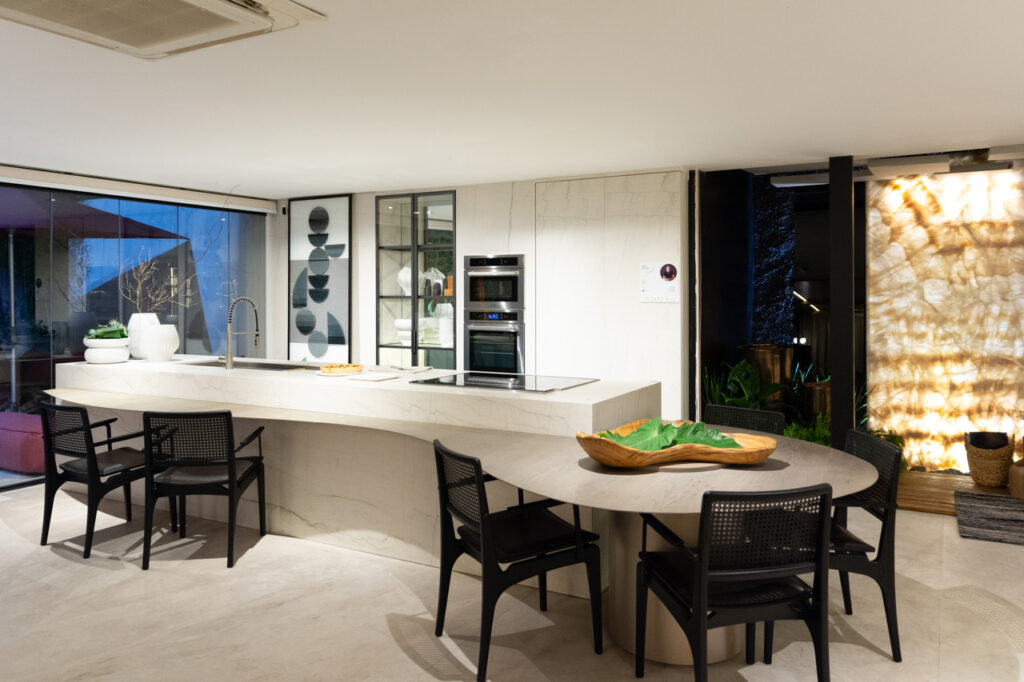 A cozinha monocromática, revestida inteiramente pelo Neolith em tom branco com veios, ganha nova cara a partir do mobiliário autoral brasileiro e pelos objetos decorativos. Um ambiente funcional e contemporâneo que abraça o visitante através de sua ilha convidativa.